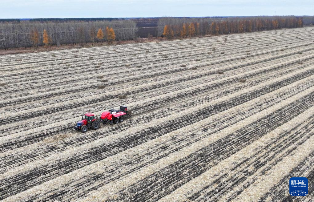 10月23日,在北大荒集团黑龙江红星农场有限公司第二管理区,大马力机车在进行秸秆打包作业(无人机照片)。