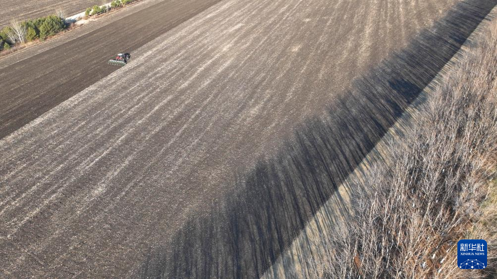 10月23日,在北大荒集团黑龙江五大连池农场有限公司共建单位五大连池市团结镇一地块,大马力机车在进行整地作业(无人机照片)。