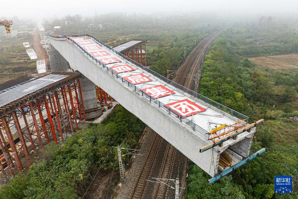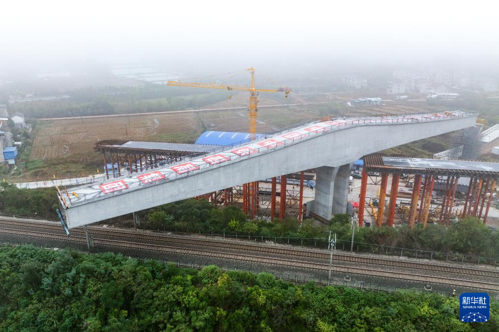 10月23日拍摄的湖北蕲春长胶廊道跨京九铁路连续梁转体作业现场(无人机照片)。