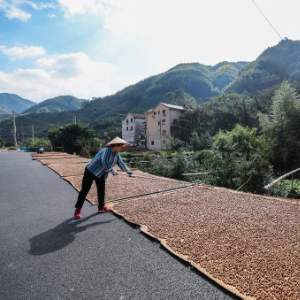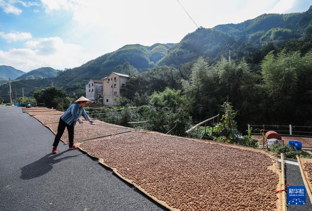 10月24日,东白湖镇里四村的香榧种植者在村道旁晾晒香榧。