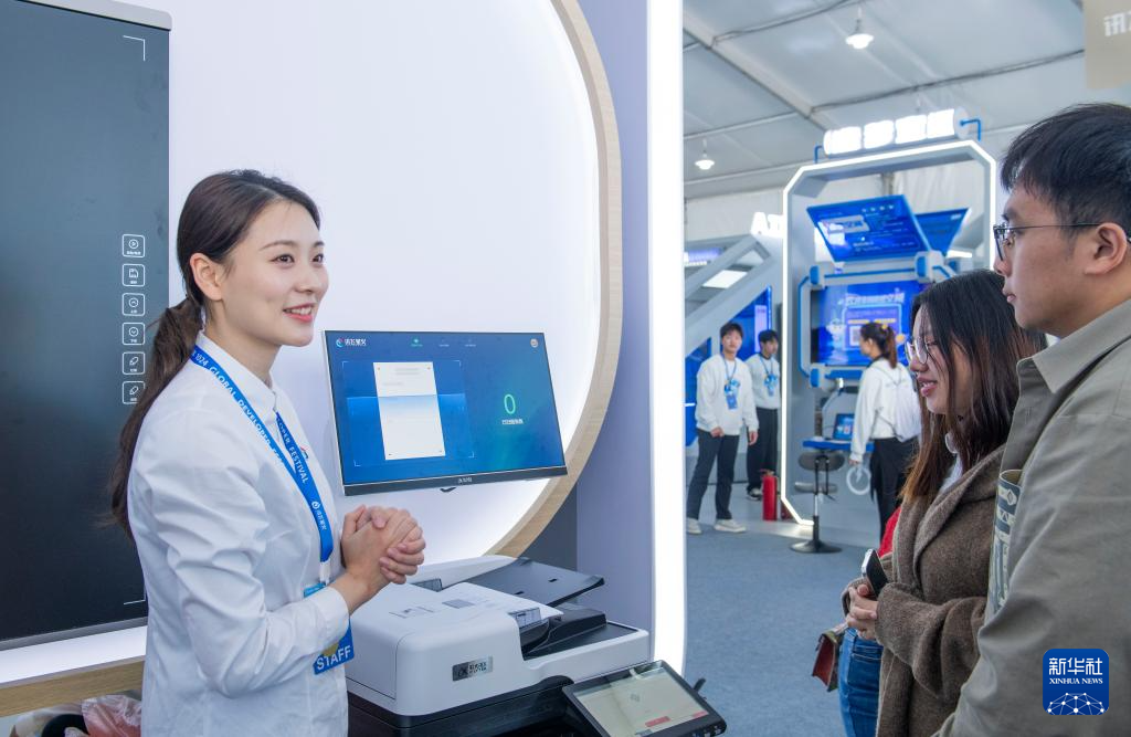 10月24日,工作人员(左一)在第七届世界声博会上向观众介绍一款智能批阅机。