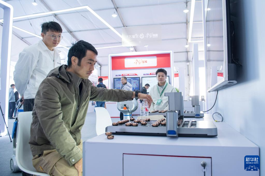 10月24日,观众在第七届世界声博会上与一款象棋机器人互动。