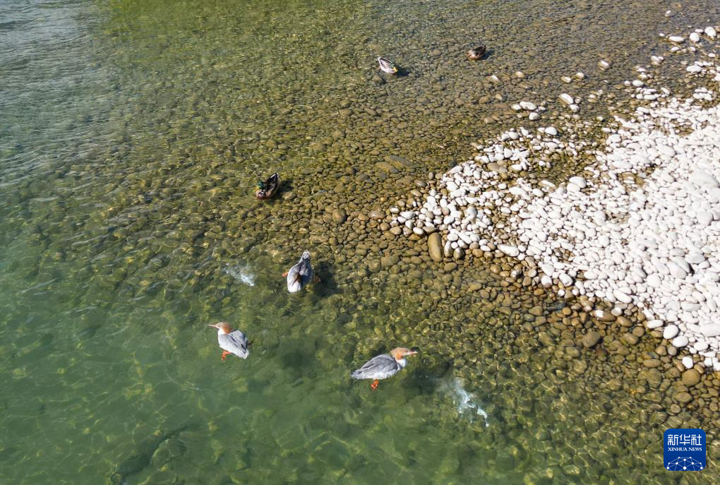 在林芝雅尼国家湿地公园内,不同种类的野生鸟类栖息在尼洋河畔(10月24日摄,无人机照片)。