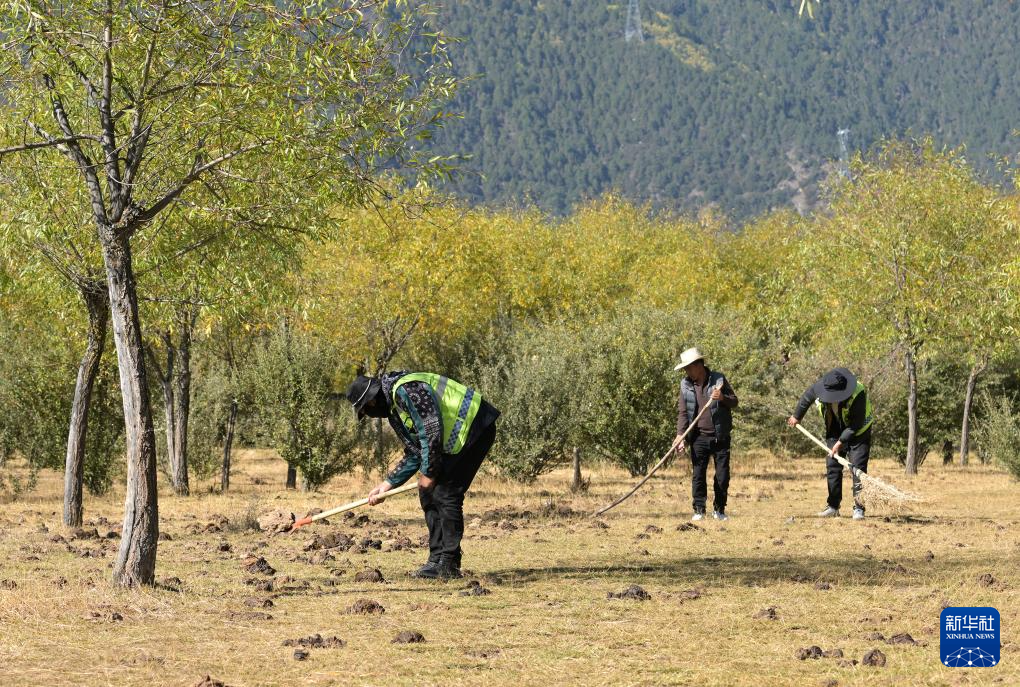 在西藏林芝雅尼国家湿地公园内,湿地管护队员们进行每日的例行清理维护(10月24日摄)。