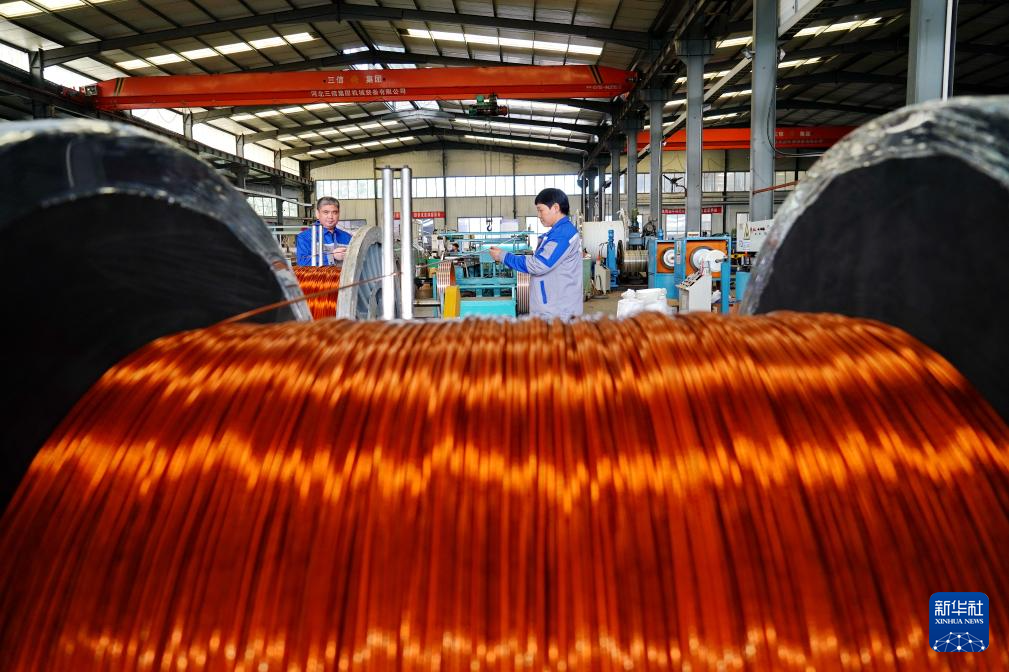 10月25日,河北省河间市常丰线缆有限公司工人在生产线上工作。