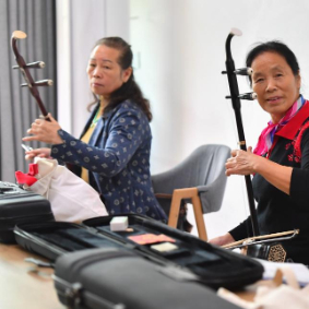 10月25日,在湘潭市雨湖区城正街街道三义井社区,学员在二胡课上练习。
