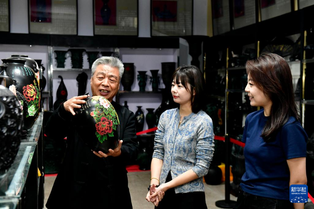 10月22日,在日照黑陶邢艺术厂,非遗传承人邢葆东向前来参观的市民推介黑陶作品。