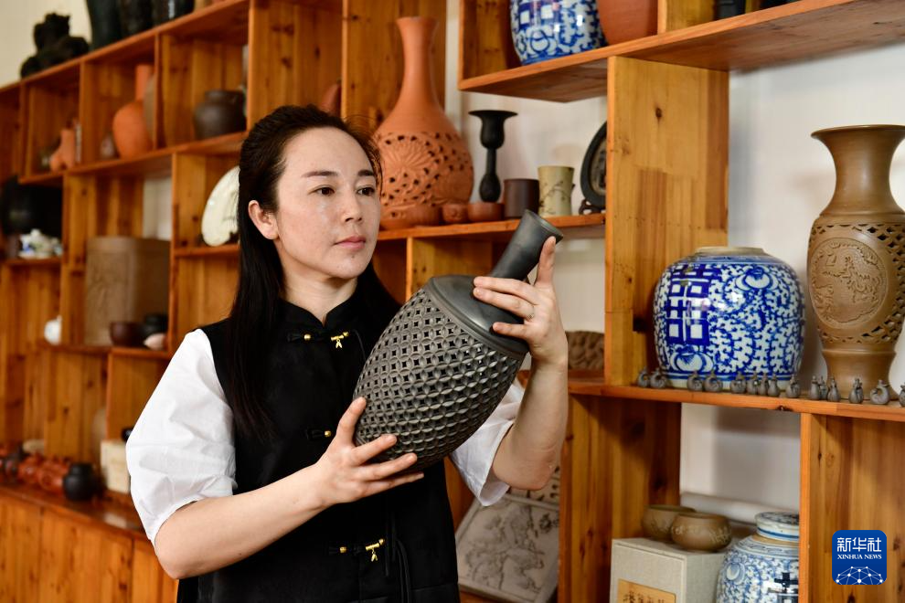 在日照高新区慧敏非遗工作室,非遗传承人秦慧敏在查看黑陶设计样式(5月26日摄)。