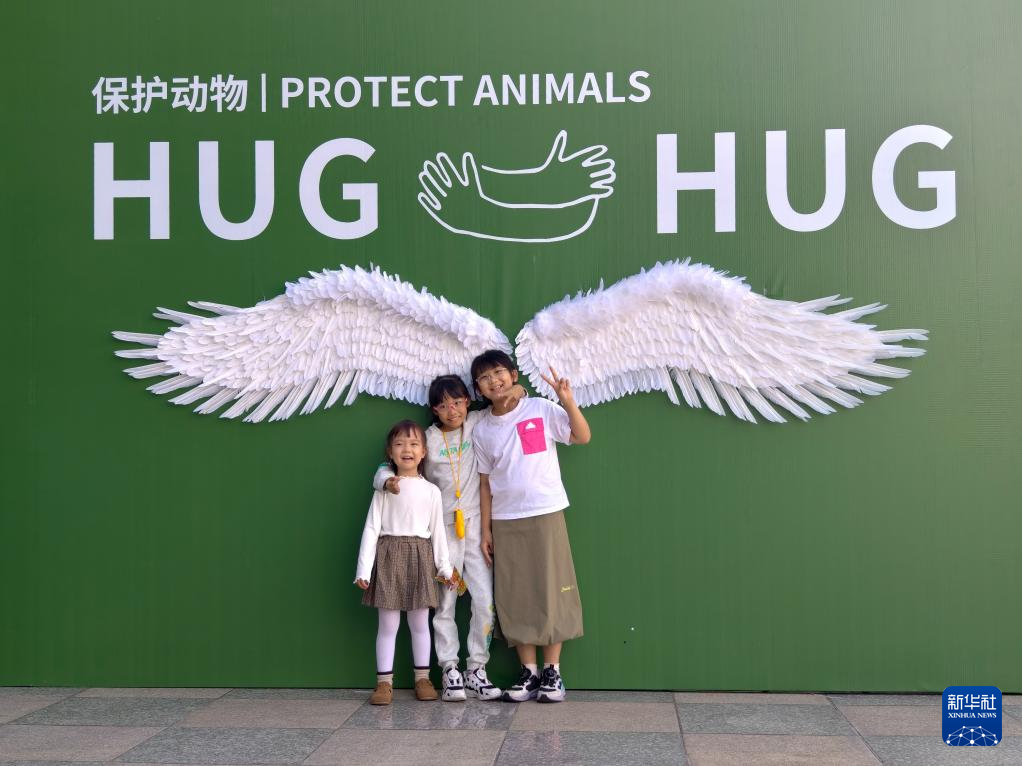 10月26日,三名小朋友在2024全国爱鸟周自然笔记总结暨福建省首届野生动物文化交流活动宣传板前拍照。