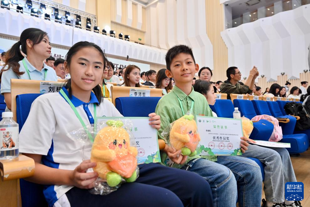 10月26日,两名获得2024年“爱鸟周”自然笔记比赛优秀奖的学生展示奖品和证书。