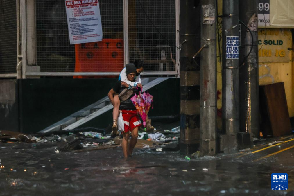 10月24日,在菲律宾奎松市,一名男子背着女子涉水前行。
