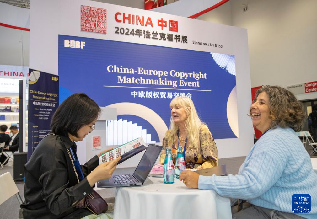 10月17日,一名参观者在德国法兰克福书展中国联合展台举办的“中欧版权贸易交流会”上洽谈。