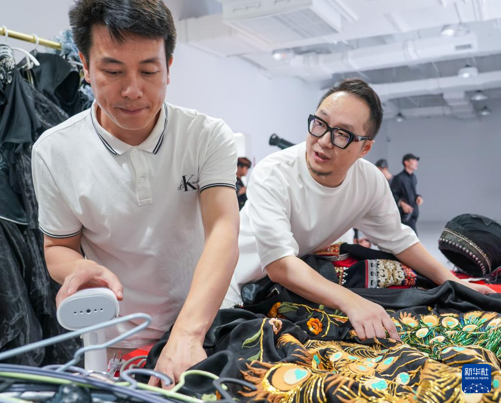 8月27日,在昆明一处摄影棚内,云南艺术学院设计学院服装与服饰设计系教师范佳(右)和同事打理彝绣服饰。范佳是赴巴黎参展彝族服饰作品的设计师之一。