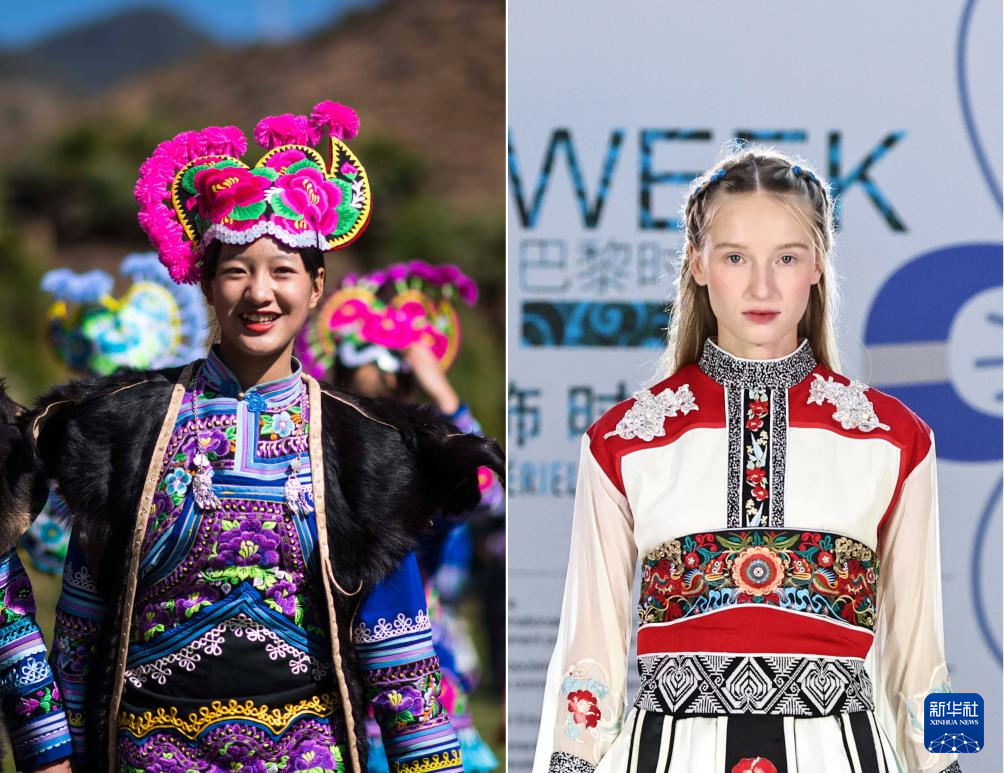 这是一张拼版照片:左图为2019年2月19日拍摄的一名年轻女孩在楚雄彝族自治州永仁县直苴村参加赛装节(新华社记者 江文耀 摄);右图为2024年9月26日拍摄的模特在法国巴黎举行的中国楚雄非遗服饰时装展上展示时装(新华社记者 高静 摄)。