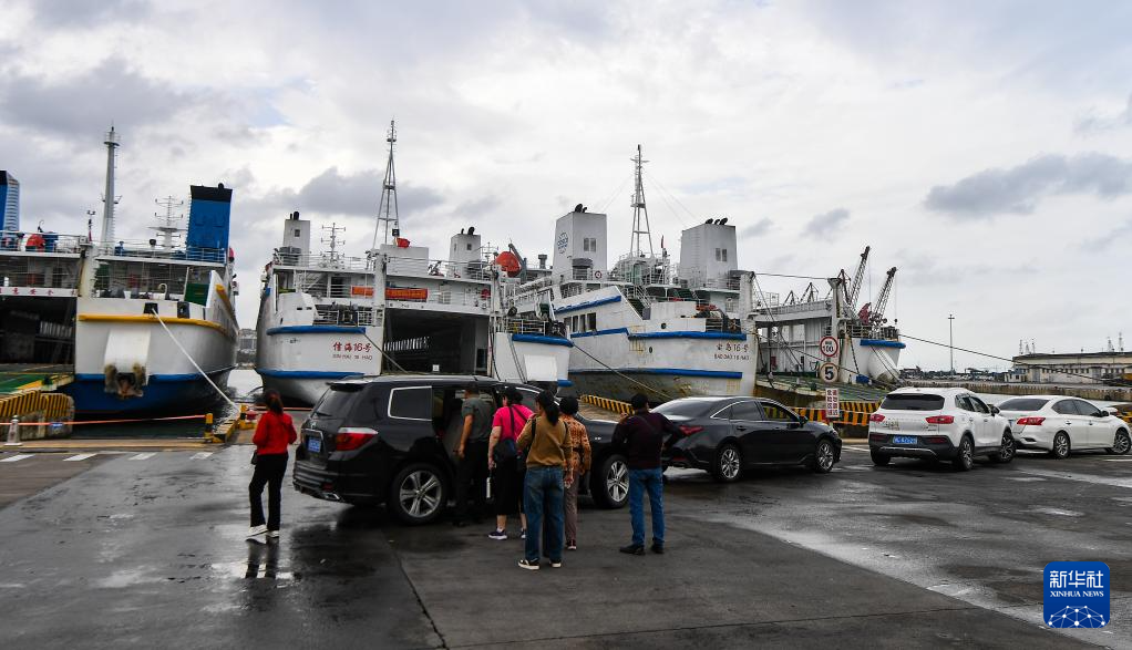 10月27日,在海南省海口市秀英港,人员和车辆在码头等待上船。