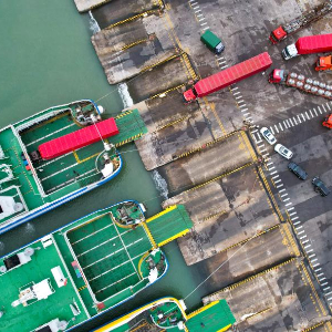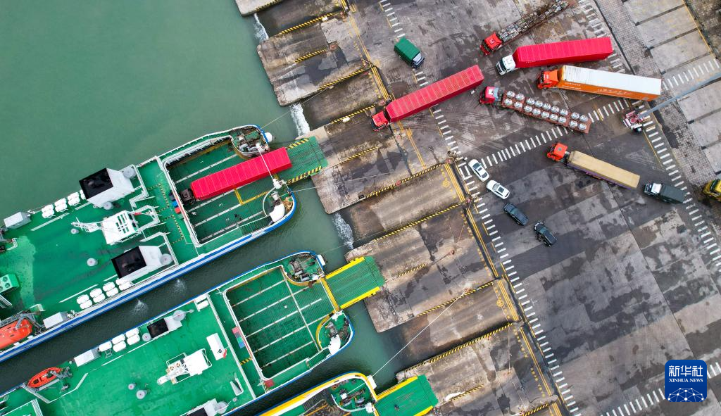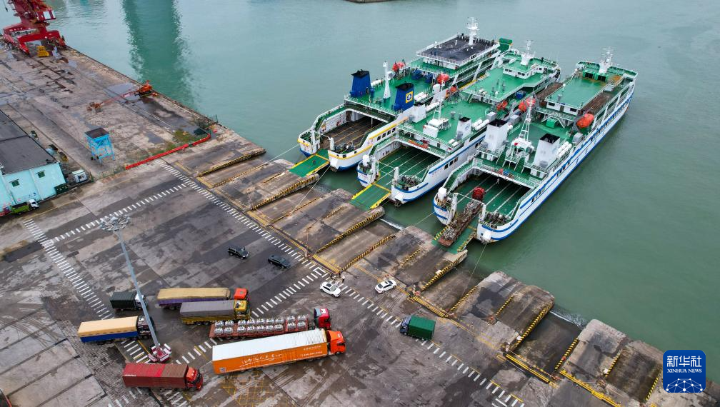 10月27日,在海南省海口市秀英港,货车有序驶入客滚船(无人机照片)。