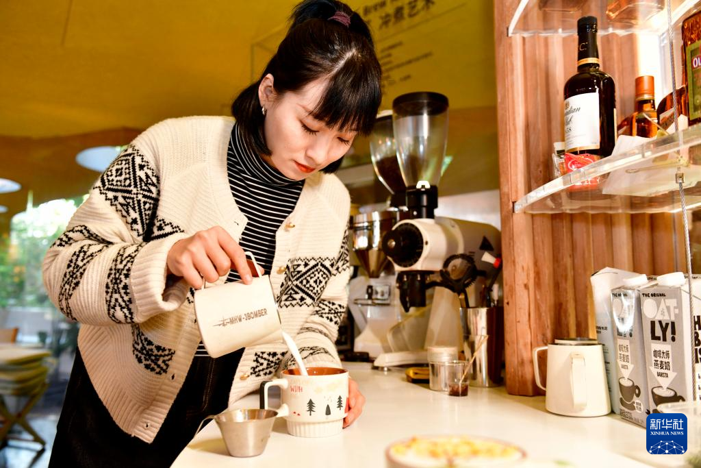 10月23日,在日照市五莲县白鹭湾小镇咖啡与树咖啡厅,咖啡师赵敏在制作咖啡。赵敏2021年辞去幼师工作,来到白鹭湾小镇,成为一名咖啡师。