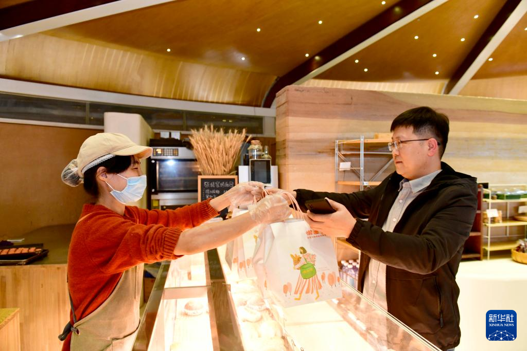 10月23日,在日照市五莲县白鹭湾小镇面包房,面包师舒熹(左)将包装好的面包递给客人。2014年,在外地从事平面设计的舒熹辞职来到白鹭湾小镇,经过培训成为一名面包师。
