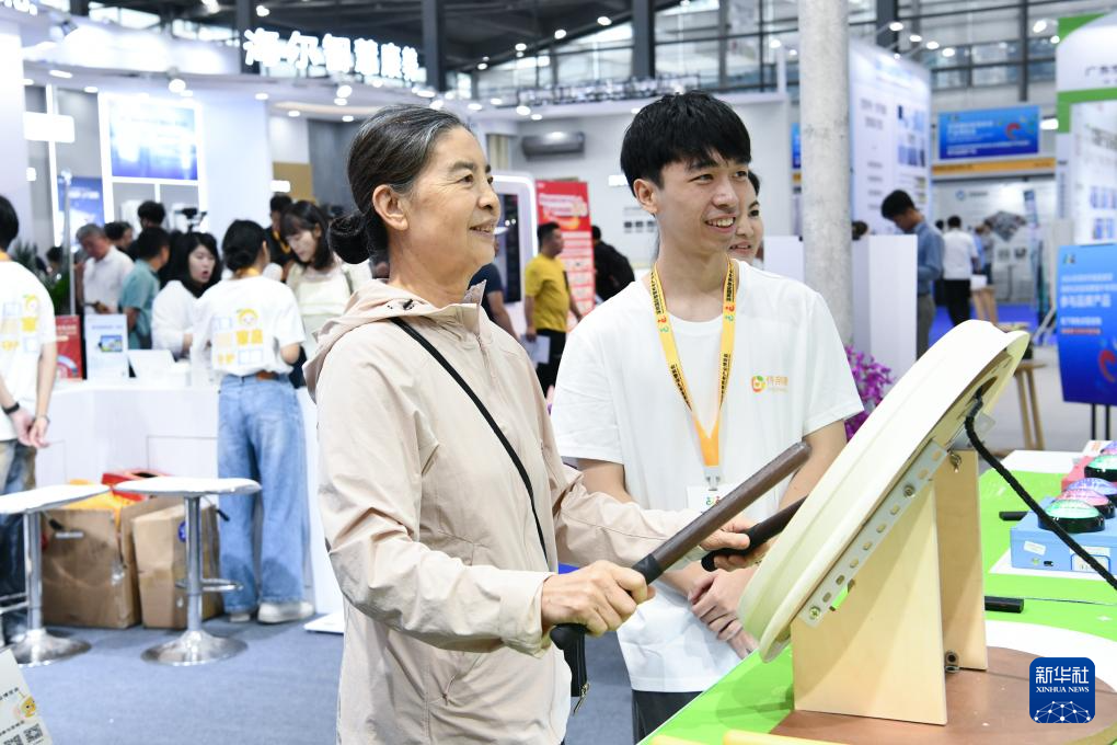 10月27日,老人在博览会上体验乐龄鼓。