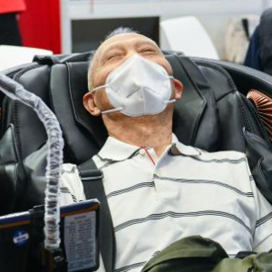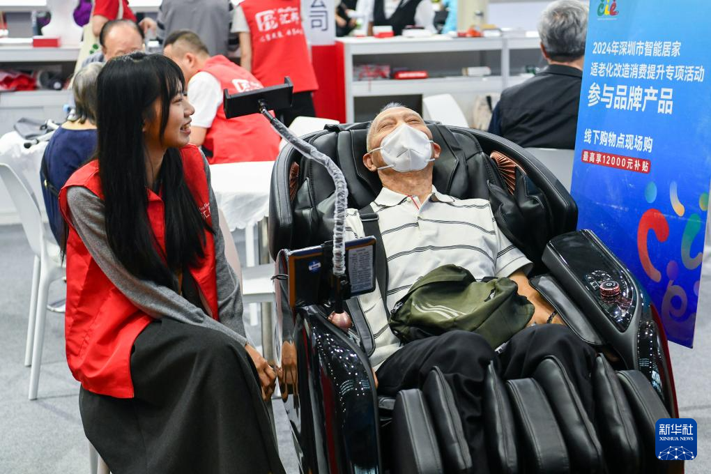 10月27日,老人在博览会上体验按摩椅。