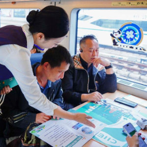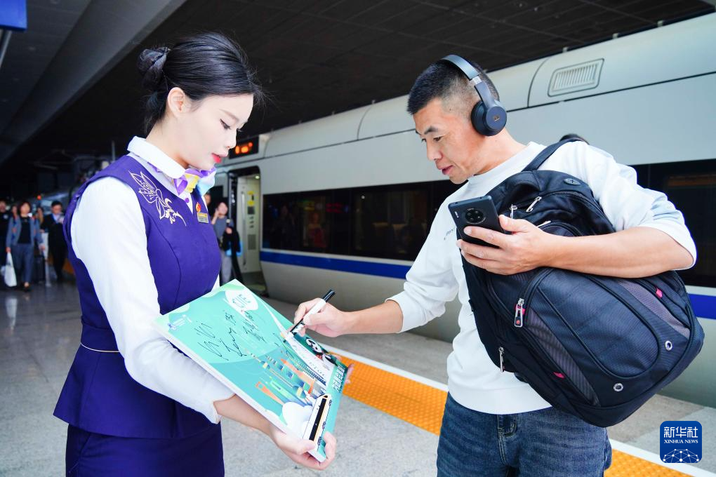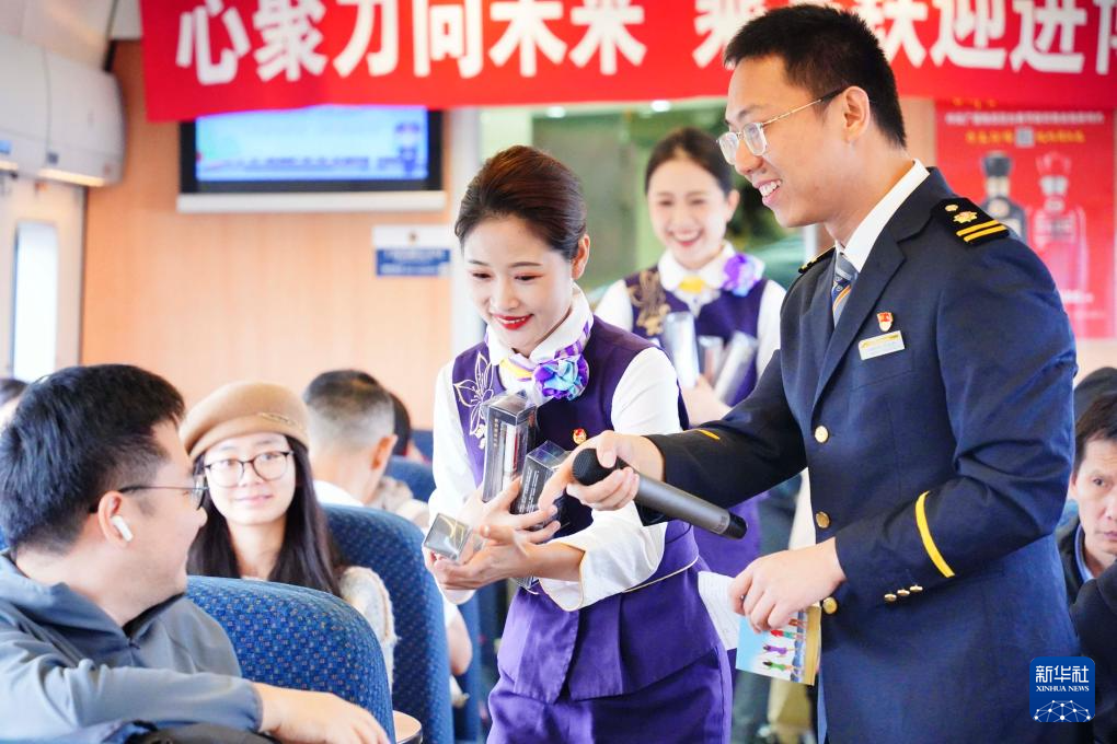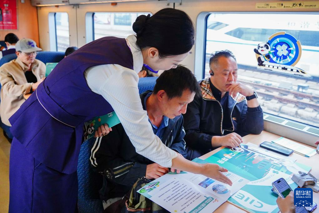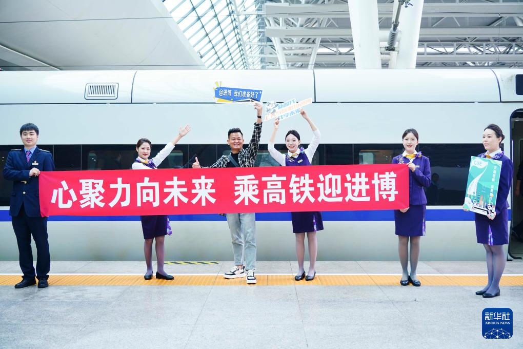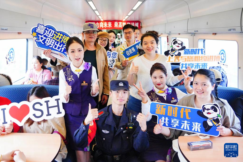 第七届中国国际进口博览会开幕在即,10月28日,铁路上海客运段在D3205次列车上开展“心聚力向未来 乘高铁迎进博”主题活动,向旅客介绍进博会亮点,为进博会送上祝福。