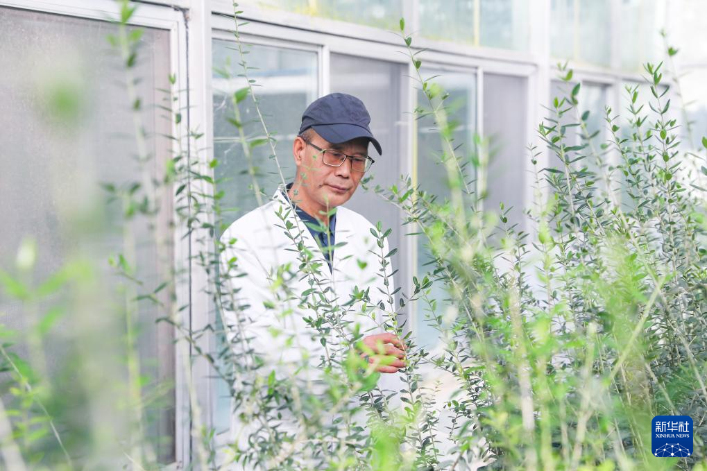 10月28日,在位于甘肃省陇南市武都区的陇南市经济林研究院油橄榄研究所大堡油橄榄试验园,陇南市经济林研究院油橄榄研究所高级工程师王贵德在智能温室内观察杂交种苗生长情况。