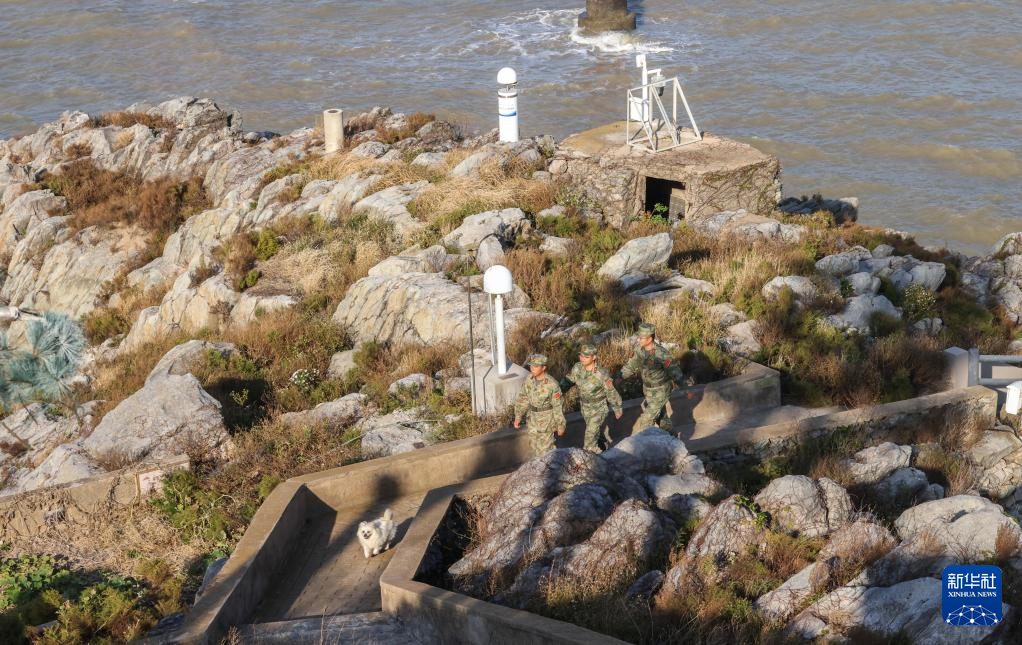 开山岛守岛民兵孙存东、王凯洋、李富明(从前至后)在巡岛路上(10月25日摄)。新华社记者 吕帅 摄