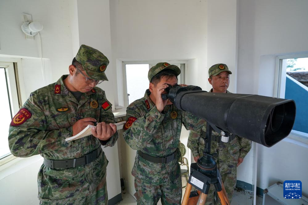 开山岛守岛民兵用望远镜对海面情况进行巡视(10月26日摄)。新华社记者 李博 摄