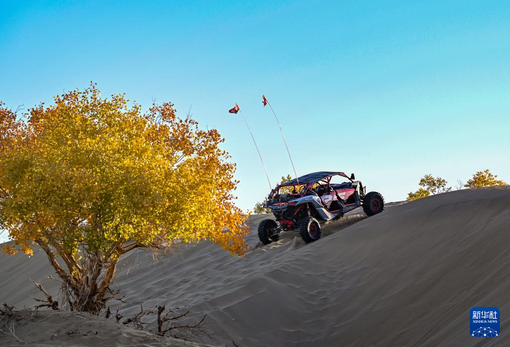 游客乘坐沙漠越野车在葫芦岛景区内观赏胡杨(10月26日摄)。