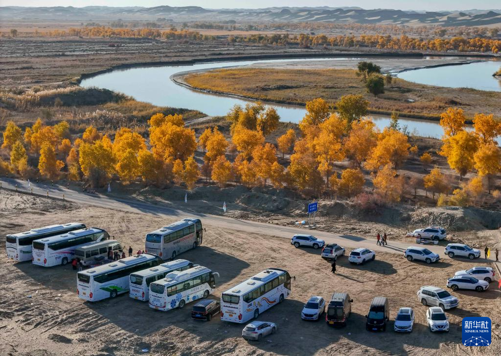旅游大巴和游客自驾车辆停靠在新疆葫芦岛景区旁(10月26日摄,无人机照片)。