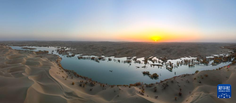 这是10月25日拍摄的夕阳下的新疆葫芦岛景区(无人机全景照片)。