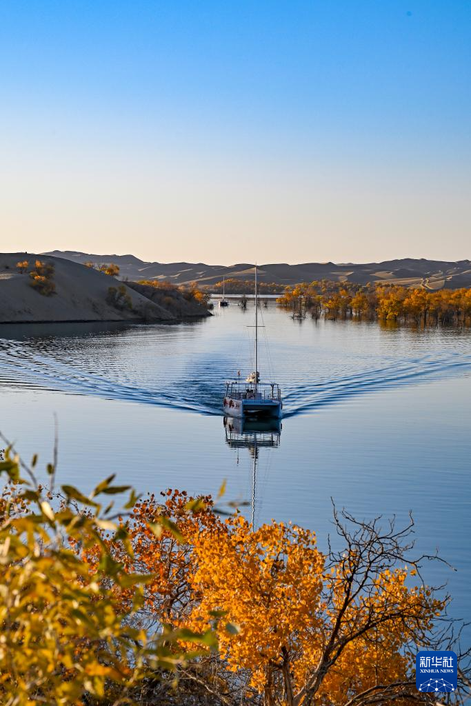 游客乘船在新疆葫芦岛景区赏秋(10月26日摄,无人机照片)。