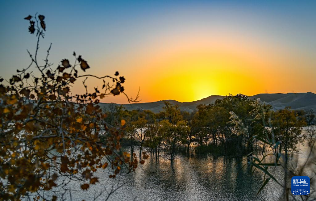 这是葫芦岛景区内落日中的胡杨林和沙山(10月25日摄)。