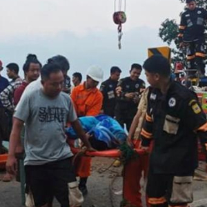 10月28日,在缅甸掸邦伊瓦岸镇,救援人员在客车坠崖位置展开救援工作。