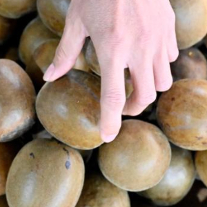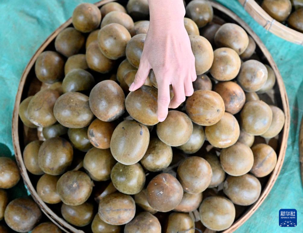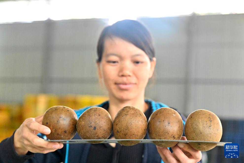 10月29日,在广西柳州市鹿寨县拉沟乡,工人在收购点里展示收购的特级罗汉果。