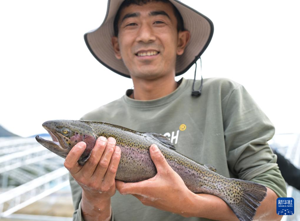 在西藏林芝市米林农场的粤林高原渔业科技园工作的藏族小伙尼玛旺堆在展示本地饲养的虹鳟鱼(10月24日摄)。