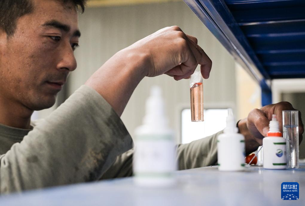 在西藏林芝市米林农场的粤林高原渔业科技园工作的藏族小伙尼玛旺堆在冷水鱼养殖大棚内检测水样(10月24日摄)。