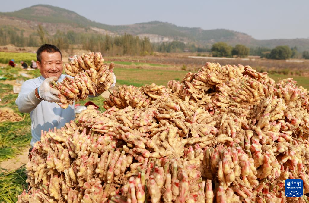 10月30日,山东省枣庄市市中区税郭镇农民在生姜种植基地收获生姜。