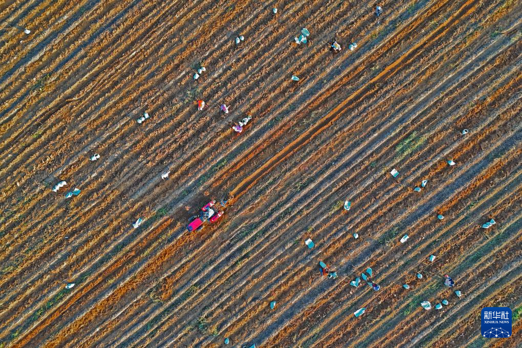 10月30日,在河北省石家庄市元氏县殷村镇殷村中药材种植田,农民们忙着采收地黄(无人机照片)。
