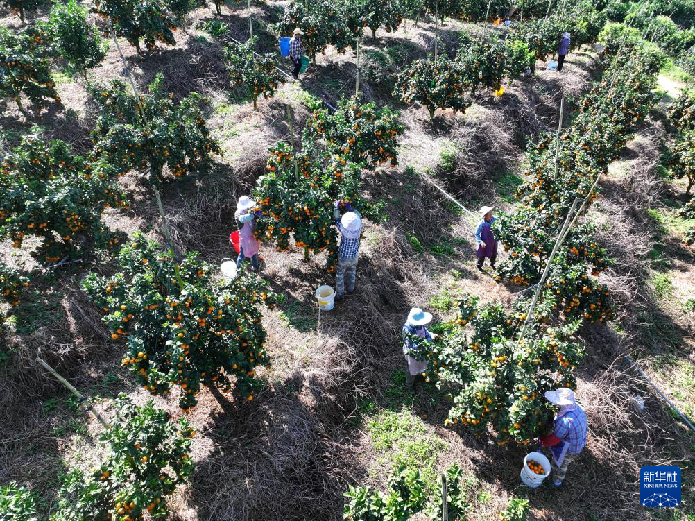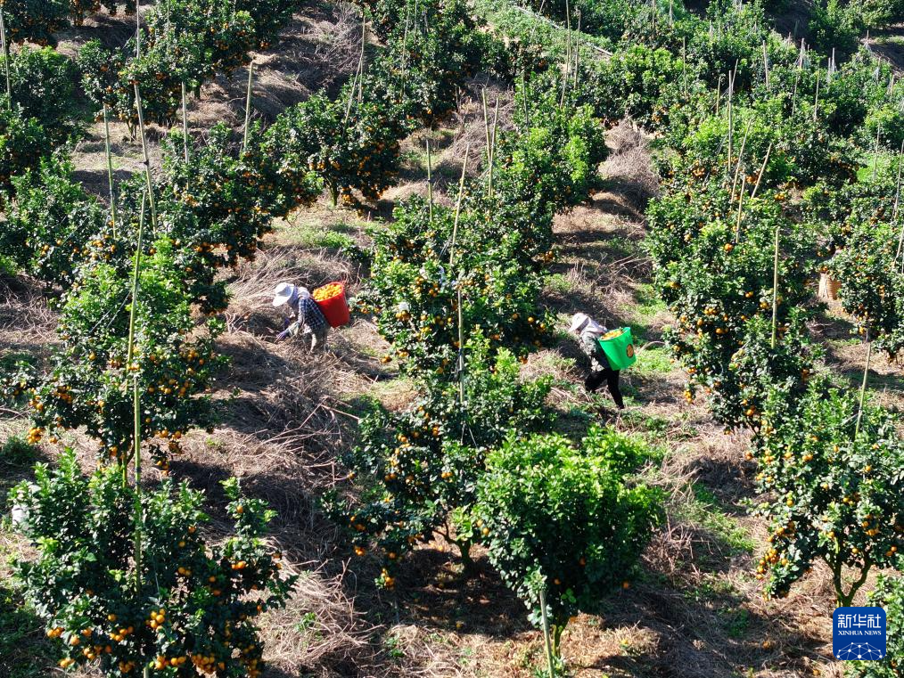 10月30日,村民在西林县那劳镇洞坚村采摘金秋沙糖桔(无人机照片)。