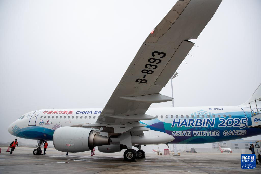 10月30日,在哈尔滨太平国际机场,“亚冬号”彩绘机准备降落。
