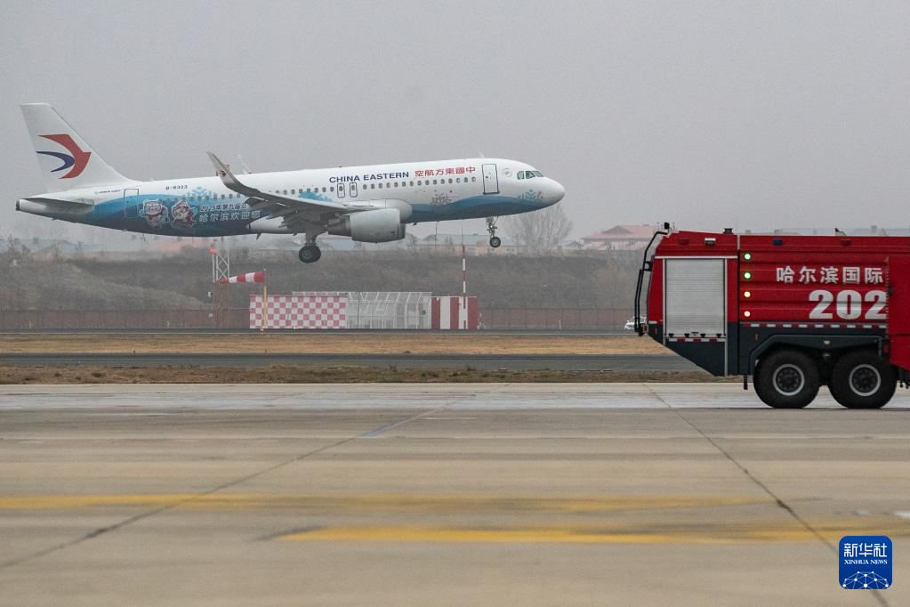 10月30日,“亚冬号”彩绘机在哈尔滨太平国际机场降落。