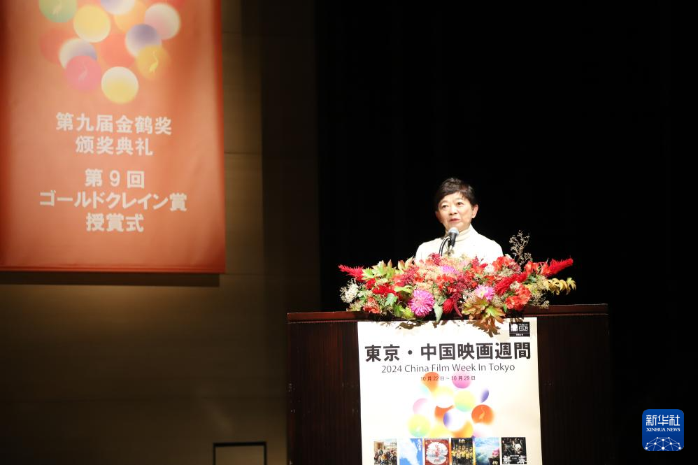 10月29日,在日本首都东京,日中电影节实行委员会副理事长渡边满子在第37届东京国际电影节中国电影周“金鹤奖”颁奖典礼上致辞。