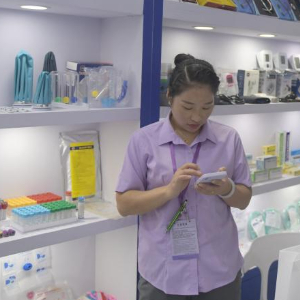 10月31日,客商在广交会上参观选购卫生用品。