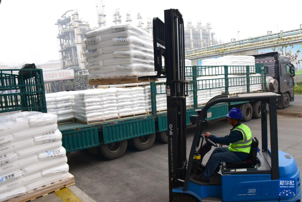 10月31日,工人在河南省鹤壁市宝山经开区一家化工新材料企业厂区将产品装车外运。