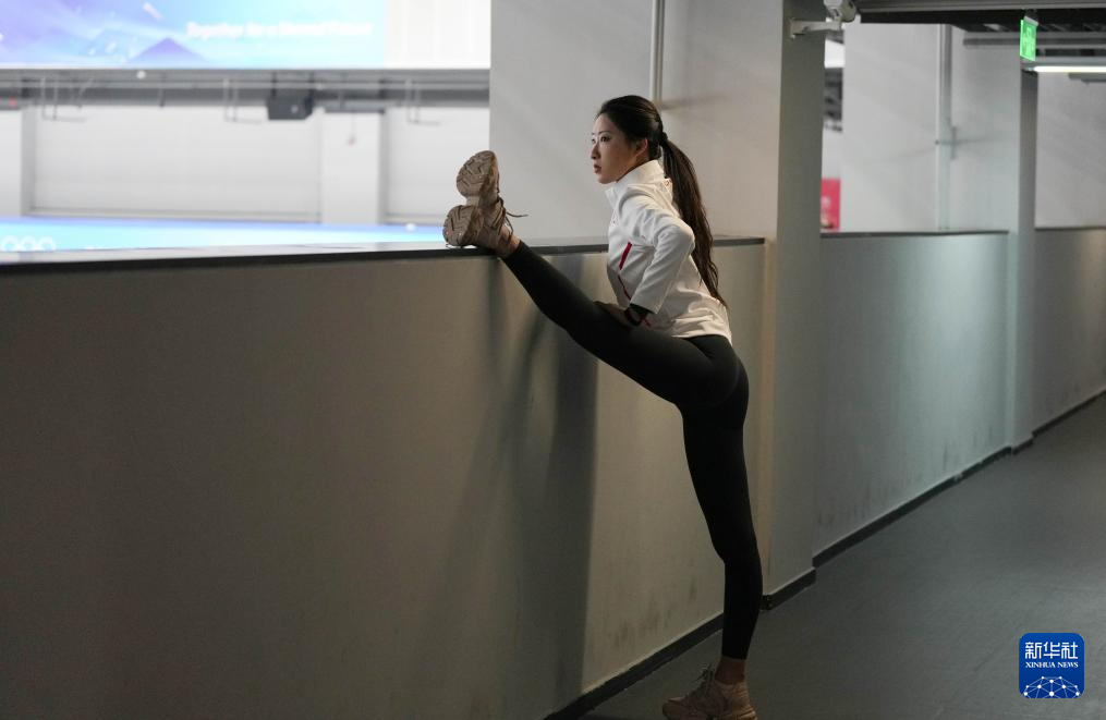 11月1日,女子单人滑运动员陈虹伊在训练前拉伸。