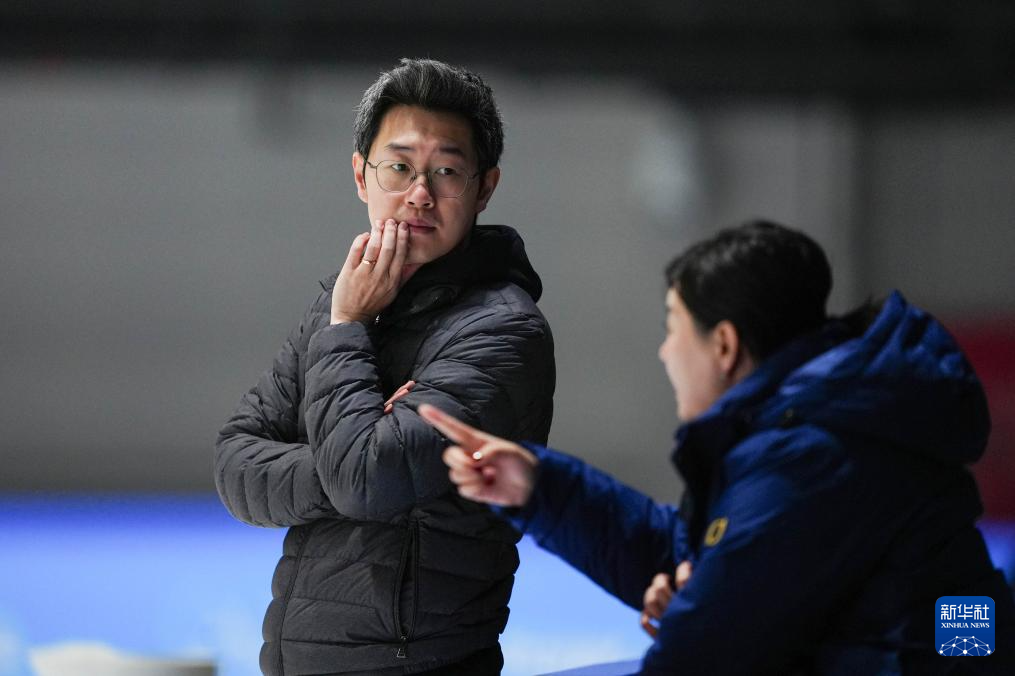 11月1日,双人滑教练员关金林(左二)观看运动员训练。