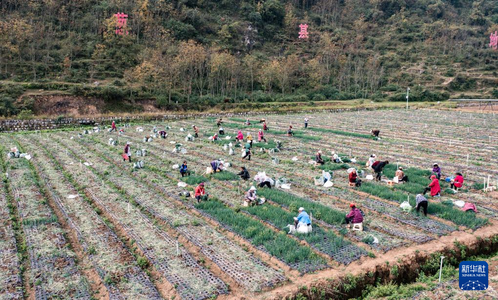 10月31日,村民在赫章县松林坡白族彝族苗族乡的香葱基地里采收香葱。
