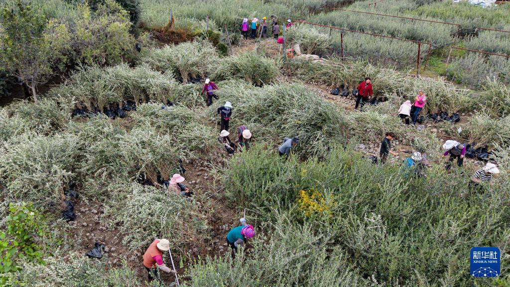 在陇南市武都区两水镇一处油橄榄育苗基地,村民在采挖油橄榄苗木(无人机照片,10月31日摄)。