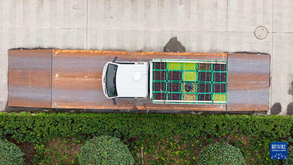 满载油橄榄鲜果的车辆驶入陇南市武都区一家油橄榄加工企业(无人机照片,10月31日摄)。